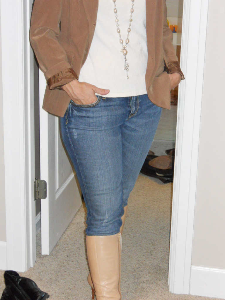 I first want to tell you all that we took a lot of Heathers old blazers and transitioned them into outfits that she could wear today. We updated the style, and made them a bit more trendier. Even just adding a piece of jewelry, scarf, belt or just rolling the sleeves up on your fun blazer makes it and entirely new outfit. So enjoy!!!